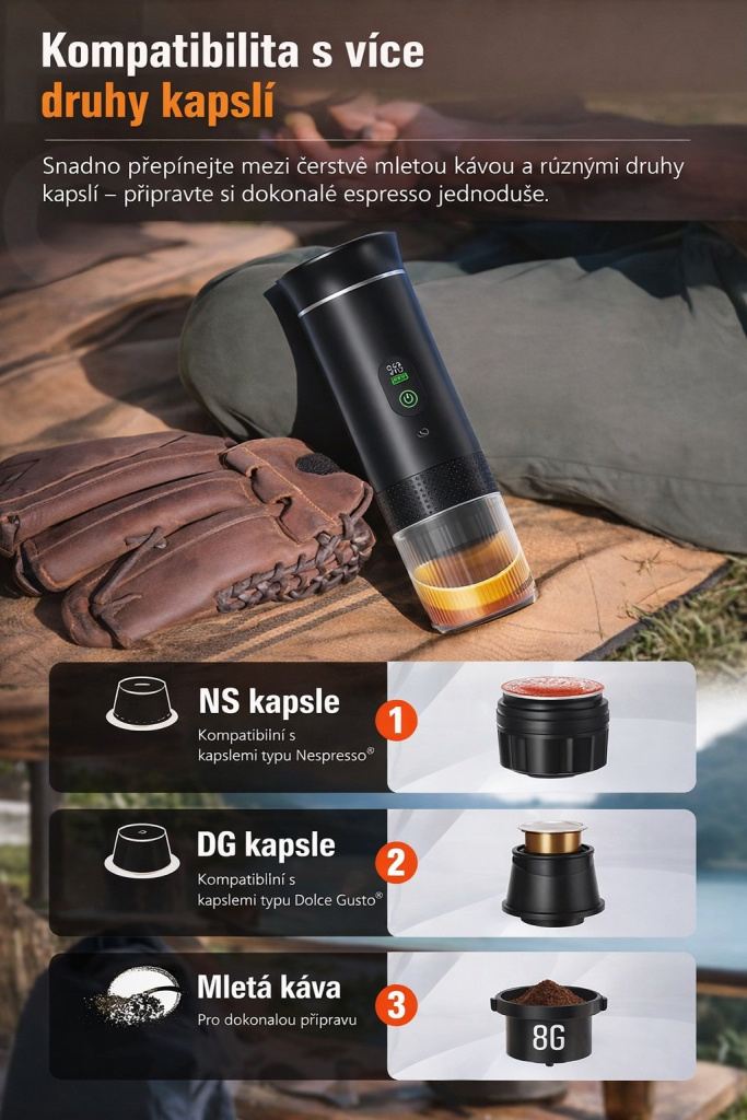 Milujete kvalitní kávu i mimo domov? Tento kompaktní a výkonný přenosný kávovar vám umožní vychutnat si plnohodnotné espresso na cestách, v kanceláři, při kempování i doma. Díky kompatibilitě s kapslemi Nespresso®, Dolce Gusto® i mletou kávou nabízí maximální flexibilitu a jednoduché použití.