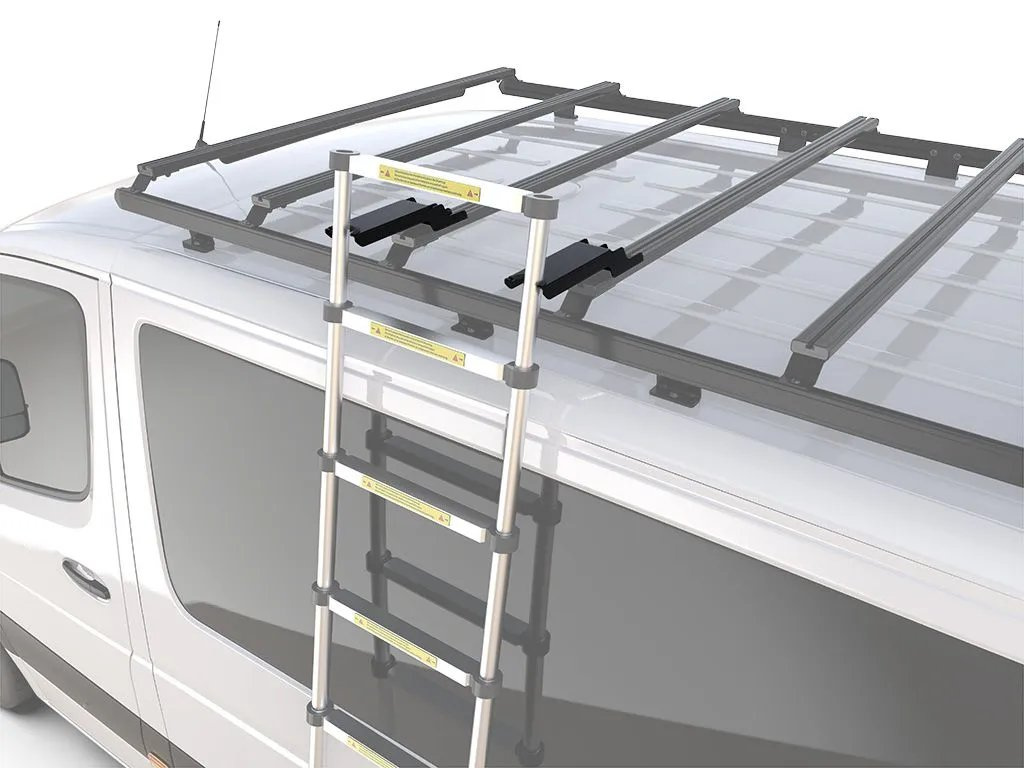 Držák byl navržen pro práci s Front Runner Hliníkovým teleskopickým žebříkem o použitelné výšce 2,9m. Žebřík je možné snadno složit a uložit, když se nepoužívá. Dvojice podpěr zabraňuje posouvání žebříku do stran a umožňuje bezpečné opření žebříku o nosič.